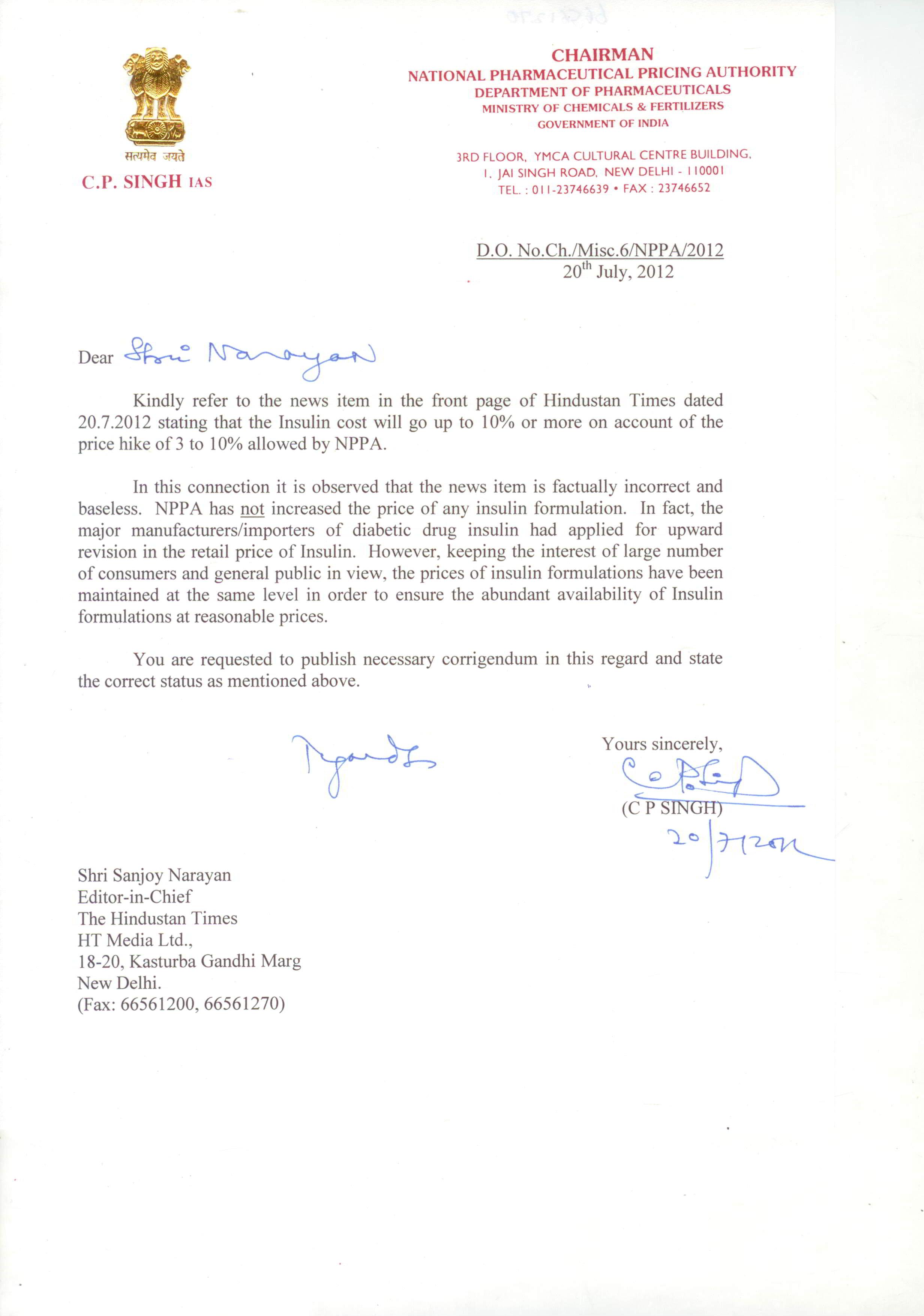 Clarification on the News items in Hindustan Times dated 20.07.2012 relating to the prices of Insulin